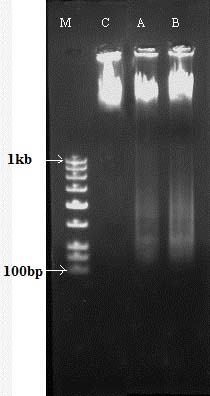 Fig. 6: DNA laddering of the genomic DNA extracted from B16F-10 cells after exposure to PE extract as assessed by 0.8% agarose gel electrophoresis, EtBr staining & UV-trans-illuminance (M=Marker, C=Control, A=100 µg/ml, B=145 µg/ml of PE extract)