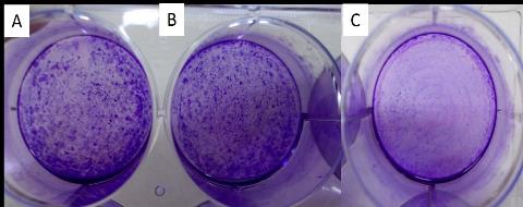 Fig. 7: PE extract suppresses the colony formation in B16F10 melanoma cell. B16F10 melanoma cell was incubated in the medium alone or the medium containing PE extract for 24h and the medium was replaced with fresh medium and incubated for 10 d. A. Control B. 50 µg/ml and C. 100 µg/ml