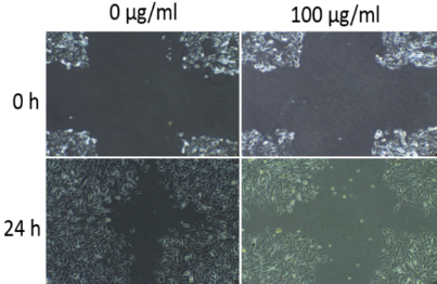 Fig. 8: Effect of PE extracts on B16F10 Melanoma Cell Migration. Wound healing assay was performed to assess cell migration. Cells were treated with 100 µg/ml of PE extract