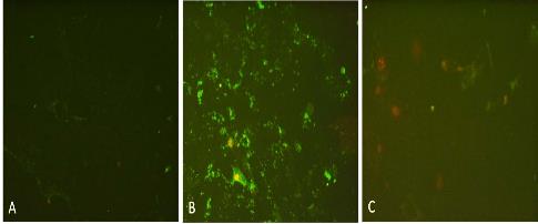 The results obtained with acridine orange & ethidium bromide double staining of control and treated B16F-10 cells are presented in the fig. 3. The untreated control cells fluoresced uniformly green and had normal features whereas cells treated with PE extract fluoresced orange-red that indicated the apoptotic features such as cell shrinkage, chromatin condensation, nuclear fragmentation and apoptotic body formation.
