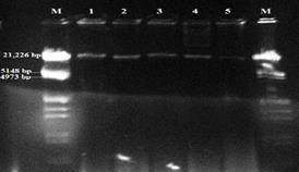 Fig. 1: Plasmid profile of ESBL producing Acinetobacter spp M: λ DNA (EcoR1+Hind III digested); 1,2,3,4 and 5: presence of plasmid DNA