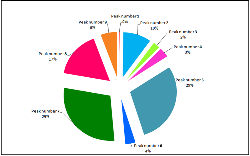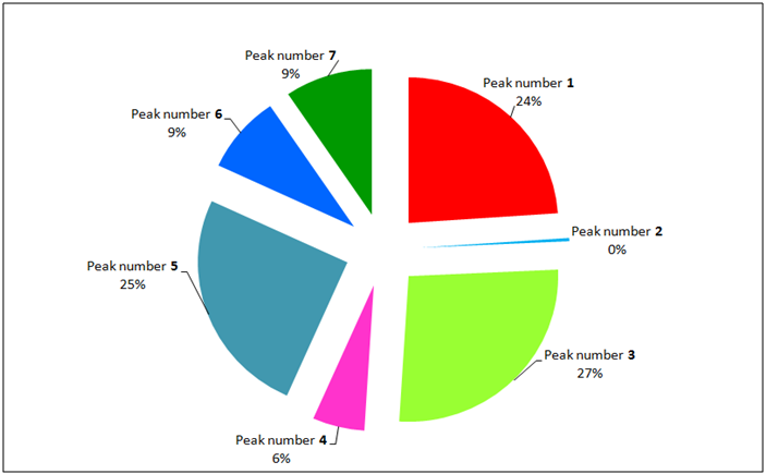 HPLC analysis was performed with LMW peptides because strong bioactivity was obtained only with LMW peptide fractions. The HPLC chromatogram profile of isolated LMW peptide(s) extract from 7d old seedlings of wheat and mung bean clearly revealed a specific pattern according to their stationary and mobile phase interaction (fig. 1, fig. 2). This separation pattern appears on the retention time of peptide and helped us to purify the exact peptide(s) fractions and concentrated it for repeated cycles. In the case of wheat, six peaks were clearly identified, whereas nine peaks were detected with mung bean peptides. The measurement of the amount (concentration) of a peptide in the sample is conducted by two ways, first by determination of the peak height from the baseline, and secondly, by determination of the peak area. In many cases, a linear relationship was found in between height or area and the concentration of peptides. The area and height of the wheat and the mung bean peptide peak appeared in HPLC chromatogram detector is represented in fig. 3 (a, b) and fig. 4 respectively.