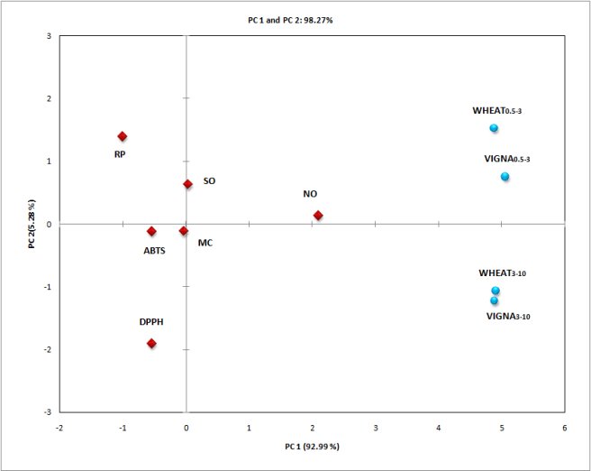 The antioxidant activity of isolated peptides was molecular weight dependent. Our result is in agreement with the results reported previously in quinoa [29] and hemp seed [30], which showed that LMW peptide fractions had higher DPPH scavenging activities than HMW peptides. In between 0.5-3 kDa, the higher antioxidant potential was demonstrated by peptides as observed in case of peptides isolated from mulberry leaves also [16]. It was also observed that wheat peptides have comparatively higher scavenging activity than mung beanpeptides in both molecular ranges. The results signify that smaller size peptides exhibited better-reducing power than high molecular weight fractions. In contrast, Girgih et al. [30] reported that the reducing power activity was enhanced to increase in molecular weight of peptides in hemp seed protein. Through PCA analysis, it might be stated that superoxide, nitric oxide and reducing power characterized the antioxidant activities of wheat and Vigna peptides at 0.5-3 kDa ranges. On the other hand, ABTS and DPPH influenced antioxidant activities of HMW peptides.