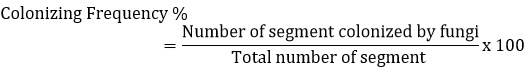Colonization frequency (CF%) was calculated as described by Suryanarayanan et al. [14] and Photita et al. [15]. Colonization frequency (%) of an endophyte species was equal to the number of segments colonised by a single endophyte divided by the total number of segments observed x 100.