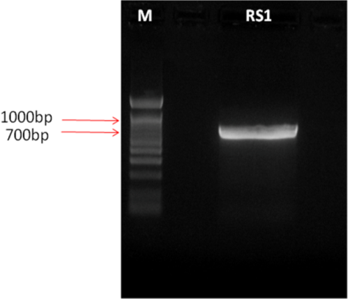 Fig. 1: 1% Agarose gel data showing the band of amplified DNA (700bp)