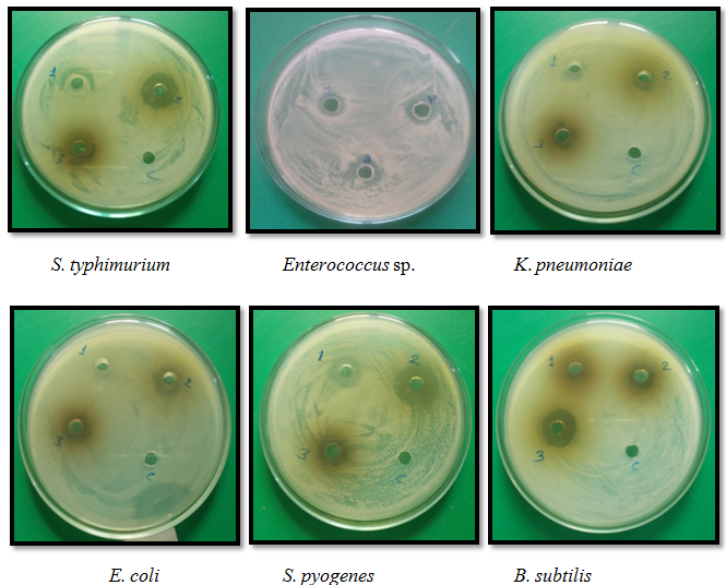 The six pathogenic bacteria strain Bacillus subtillis, Streptococcus pyogenes, Escherichia coli, Klebsiella pneumoniae, Salmonella typhimurium and Enterococcus sp. was provided by the Fungal Biotechnology and Invertebrate Pathology Laboratory (FBIPL), RDVV, Jabalpur (M. P.). Bacterial cultures were maintained on nutrient agar medium slant (NAM) and incubated at 37 °C for 24 h in the bacterial incubator and stored at 4 °C for preservation.