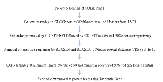 De novo sequence assembly is the method of generating contiguous sequences by merging together individual sequence reads. These contiguous sequences or contigs share the same nucleotide sequence as the template (DNA or RNA) from which they are derived. As next generation sequencing technologies are revolutionizing, there is a limitation to the assembly programs used for short sequence data of 20-30 nucleotides such as SOLiD reads. Several algorithms are reviewed for De novo assembly [2-5] and have been implemented by many software packages including CAP3 [6], Velvet [7], Oases [8], Trinity [9], Trans-ABySS [10], but none of them can be individually used for the assembly of solid reads. The main reasons are a large number of sequences generated which makes the analysis computationally costly and base calling errors are more likely to occur due to their short length. Wheat is an allohexaploid containing homeologous and duplicated genes. Wheat contains 80% of repetitive sequences. It becomes difficult to resolve repetitive sequences since; the reads generated by sequencing are shorter than the repetitive unit. This can lead to misassembled or partial assembled contigs. Another limitation to the assembly of short sequence reads is that most of the assemblies have been reported with long sequences [11] or with a combination of short and long reads [12]. Short read technology such as IIlumina has been successful in a wide variety of transcriptome analysis in plants with paired-end sequences [13, 14]. Assembly of single-ended solid sequences is difficult. However, studies [15, 16] support assembly of short sequence reads of 20-30 nucleotides long with gaps. Combinations of De novo assembler have been used to reconstruct high-quality transcriptome in polyploids [17]. We present a method for assembly of short reads where multiple k-mer and combination of assembly software’s based on different algorithms is used. The basic assumption of this is that different k-mers will allow the assembly of transcripts with different abundances. At higher k-mer length more number of contig sequences are assembled which are highly expressed transcripts. On the contrary, at lower k-mer length poorly expressed transcripts are assembled better [7, 18].