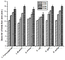 The observing capacity of 5 mm, sterile discs (Hi-media, India) ranges from 10 µl to 40 µl was selected. For the preparation of the stock solution, 10 mg of each different crude extract was dissolved in 1 ml of DMSO (Dimethyl sulfoxide). From these stocks, 10 µl, 20 µl, 30 µl and 40 µl was added on the sterile discs to get 100 µg, 200 µg, 300 µg and 400 µg respectively of plant extracts. Then, these prepared discs were used for testing antibacterial activity against the bacterial strains.