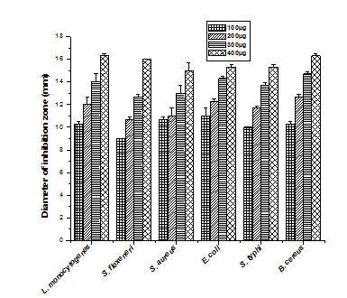 Fig.1: Antibacterial activity of methanol extract of J. sambac against foodborne pathogens