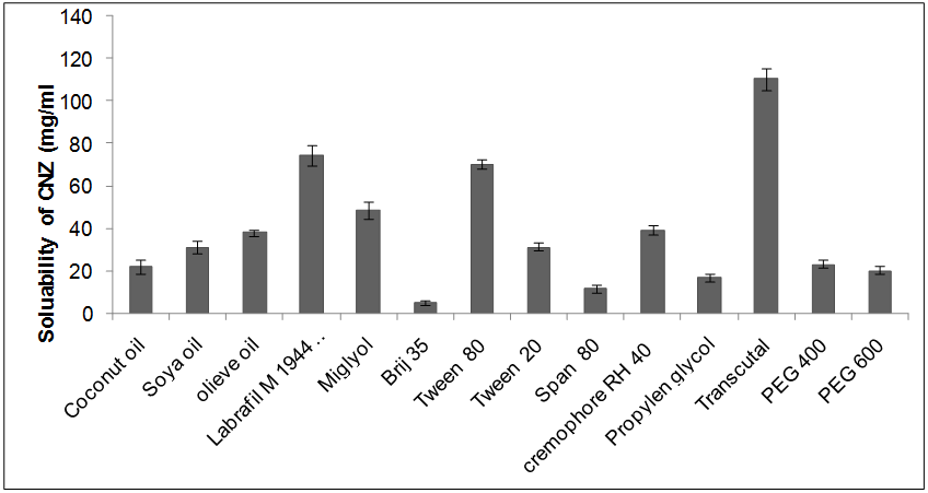 An excess amount of CNZ was added to 2 ml of various oils, surfactants, and cosurfactants, and mixed by a vortex mixer. The mixture was kept at 25 °C for 72 h till equilibrium. The sample was centrifuged at 1000 rpm for 10 min and filtered. The filtrate diluted with methanol and then the amount of CNZ was determined by UV spectroscopy at λmax 254.
