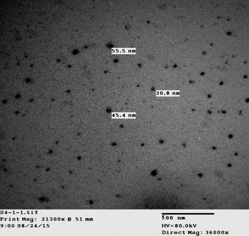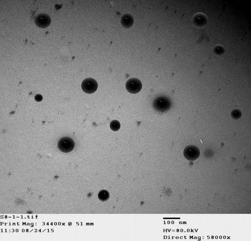 The high-resolution transmission electron microscope (TEM, JEM-1400, Japan) was used to evaluate the morphology of the liquid CNZ-SNE. The samples were diluted up to 100 times with deionized water to form nano emulsion. In the TEM technique, a drop of the formed nano emulsion was loaded on a carbon-coated copper grid. The excess was removed immediately using filter paper. 2% w/v aqueous solution of phosphotungstic acid (staining agent) was directly added to the grid and left for 45 seconds. Then, they were allowed to dry for 1 hour. After drying, the grid was directly investigated and photographed using (TEM, JEM-1400, Japan).