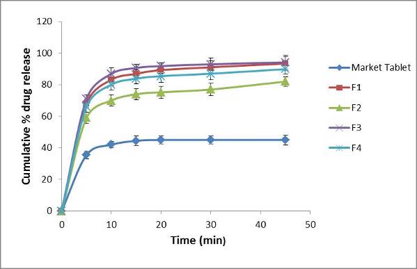 The dissolution of CNZ from the prepared tablets was performed in 900 ml of standard phosphate buffer (pH 6.8) at 37±0.5 °C using dissolution tester (Erweka, model, Germany), Apparatus II (rotating paddle the USP Dissolution test), at a rotation of 75 rpm. 10 ml from the dissolution medium was withdrawn at 5, 10, 15, 20, 30, 45 and 60 min. Samples were filtered through 0.45-μm filter (PVDF membrane, Millipore Corp., USA) and analyzed spectrophotometry (Shimadzu 1800, Japan) at 254 nm. The drug release from the formulation was measured and compared with the conventional marketed CNZ tablet (Stugeron®).