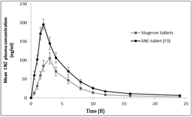 Fig. 5: Plasma concentration profiles of CNZ after oral administration of SNE tablets and Stugeron ® tables to albino rabbits (mean±SD, n = 6)