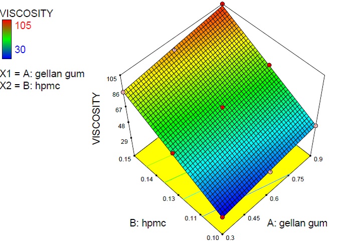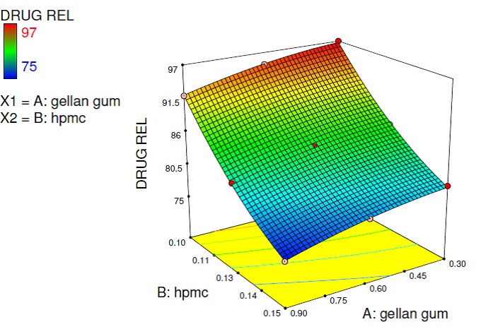 In vitro release study of the formulated in situ gel was carried out in two chamber diffusion cells through dialysis membrane-70 with the molecular weight cut off 1200-1400 KDa. Diffusion of diameter 1.5 cm and 20 ml capacity consisted of an upper cylindrical compartment open from above and diffusion membrane at its base. To prepare artificial membrane, pieces of dialysis membrane were soaked in PBS pH6.6 for hrs before mounting on diffusion cell. Dialysis experimental and the content of the receiver compartment were stirred using magnetic stirrer. The position of the donor compartment was adjusted so that dialysis membrane just touches the diffusion medium. An aliquot of 3 ml was withdrawn from receiver compartment initially after 15 and 30 min and then 1 hr interval and replaced with the same amount of fresh medium. Aliquots withdrawn were suitably diluted and analysed using UV spectrophotometer at 283.50 nm for drug. In vitro drug release was carried out for 8 hrs. membrane was in a two chamber cells. In situ gels of gellan gum with drug were placed in the donor compartment. 16 ml of PBS 6.6 was placed in the receptor compartment. The temperature of the receiver compartment was maintained at the 37∘0 C ±1.00C during experimental and the content of the receiver compartment was stirred using magnetic stirrer. The position of the donor compartment was adjusted so that dialysis membrane just touches the diffusion medium. An aliquot of 3 ml was withdrawn from the receiver compartment initially after 15 and 30 min and then 1 hr interval and replaced with the same amount of fresh medium. Aliquots withdrawn were suitably diluted and analysed using UV spectrophotometer at 283.50 nm for drug. In vitro drug release was carried out for 8 hrs.