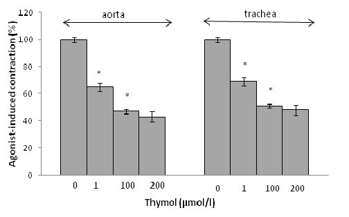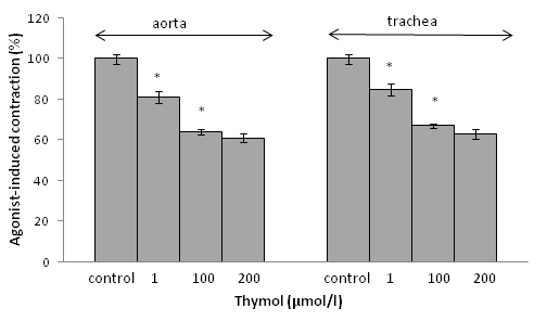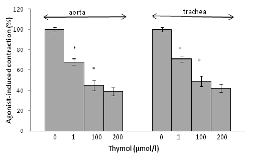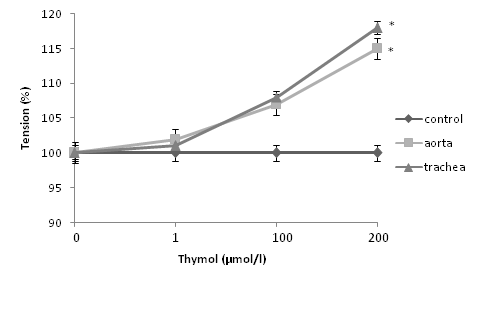 Fig. 1: Effect of thymol on resting tension of aortic and tracheal rings in the absence of agonists. Results are shown as mean±S. E. M.; n = 5; *P<0.05, thymol vs. Control (ANOVA followed by Duncan’s multiple range tests)
