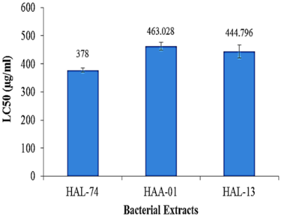 Bioactivity study of the marine sponge bacterial extracts was conducted using BSLT employing 48 h A. salina. The degree of lethality was directly proportional to the concentration of the extracts treated. The cytotoxic activity is best performed by HAL-74 isolate with an average of LC50, 378±6.07 μg/ml followed by HAL-13 isolate (LC50, 444.796±23.33 μg/ml) and HAA-01 isolate (LC50, 463.082±13.82 μg/ml) (fig. 1).