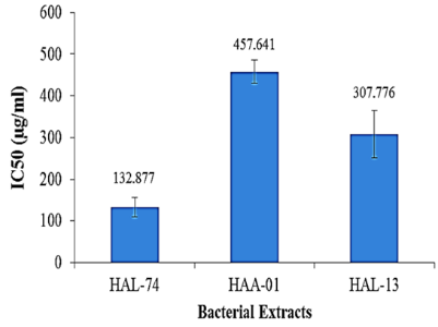 Based on the cytotoxic assay, HAL-74 extract is the most active extract among others (IC50, 132.877±22.82 μg/ml) followed by HAL-13 isolate (IC50, 307.776±57.09 μg/ml) and HAA-01 isolate (IC50, 457.641±28.41 μg/ml) (fig. 2).
