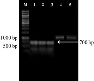 Fig. 3: DNA fragments encoding KS Domain 1 = HAL-13, 2 = HAL-74, 3 = HAA-01 and A Domain 4 = HAL-74, 5 = HAA-01 in the electrophoretic agarose gel. M = Marker 1 kb