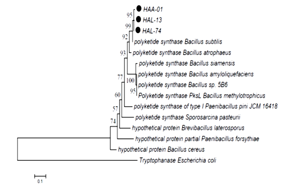 Fig. 4: Phylogenetic tree of HAL-74, HAA-01 and HAL-13 isolatesto the reference strains with based on amino acid sequences of KS domain. Numbers at the nodes indicated the levels of bootstrap support with based on 1000 re-sampled data sets. The scale bar indicated 0.1 substitutions per nucleotide position