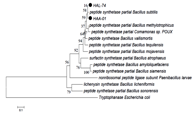 Fig. 5: Phylogenetic tree of HAL-74 and HAA-01 isolates to the reference strains with based on amino acid sequences of A domain. Numbers at the nodes indicate the levels of bootstrap support with based on 1000 re-sampled data sets. The scale bar indicates 0.1 substitutions per nucleotide position