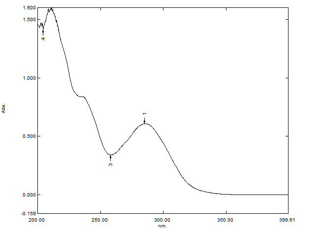 The spectra of carbamazepine in methanol showed absorption at 284 nm shown in fig. 2, which is complying with reported lmax. Hence, it was selected as lmax of carbamazepine in methanol: distilled water for further use.