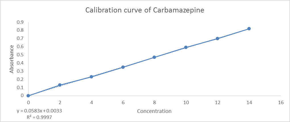 Conclusion: The results of analysis have been validated as per International Conference on Harmonization (ICH) guidelines. The developed method can be adopted in routine analysis of carbamazepine in tablet dosage form as well bulk dosage form.