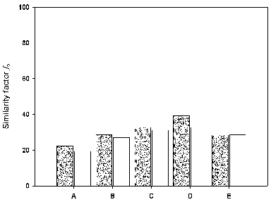Fig. 3: Similarity factor f2 of naproxen sodium (grey bars) and acetaminophen (white bars) from fixed-dose combination formulations (A-E). None dissolution profile was considered similar to the dissolution profile of the reference product (f2<50).