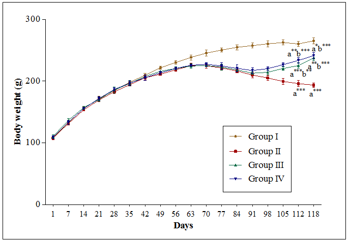 Each value shows mean±SEM; n=6. where, a-Group II, III, IV compared with Group I, b-Group III, IV compared with Group II,***-p<0.001, **-p<0.0, *-p<0.05; Group I-normal control; Group II-Induced Control; Group III-DMBA+NGN(40 mg/kg b.w.); Group IV-DMBA+NGN (80 mg/kg b.w.)