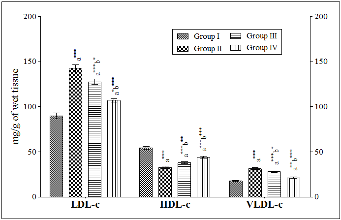 Each value shows mean±SEM; n=6. where, a-Group II, III, IV compared with Group I, b-Group III, IV compared with Group II,***-p<0.001, **-p<0.0, *-p<0.05; Group I-normal control; Group II-Induced Control; Group III-DMBA+NGN(40 mg/kg b.w.); Group IV-DMBA+NGN (80 mg/kg b.w.). LDL-c: Low-density lipoprotein cholesterol, HDL-c: High-density lipoprotein cholesterol, VLDL-c: Very low density lipoprotein cholesterol