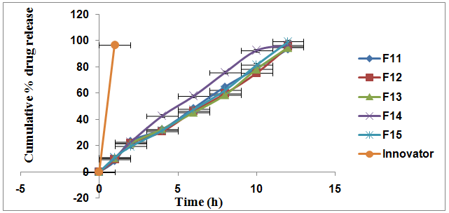 Fig. 4: Cumulative percentage drug release of formulations F11-F15