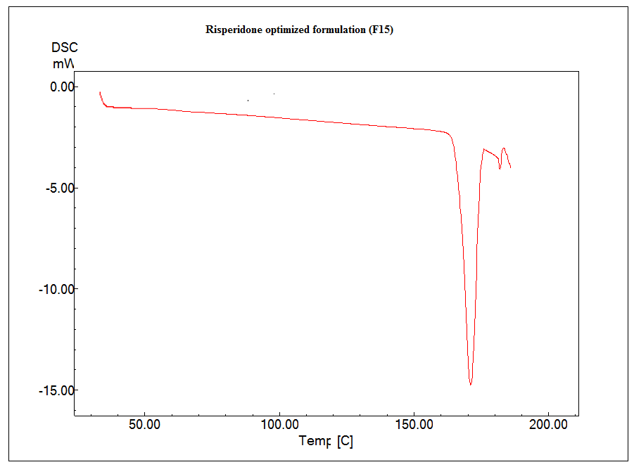 The DSC thermogram of the pure Risperidone (fig. 8) and optimized formulation (F15) (fig. 11) showed endothermic peaks of the pure Risperidone and the Risperidone in the formulation at 170.94 and 171.39 °C respectively. The endothermic peaks of the HPMC K100 and WSR 301 were also shown in fig. 9 and 10 respectively. It indicates that there is no interaction takes place between drug and other excipients used in the formulation.