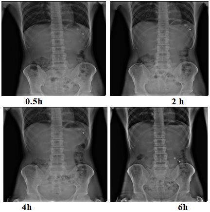 Fig. 12: Radiographic images of optimized risperidone floating tablet (F15) in the stomach at different time intervals