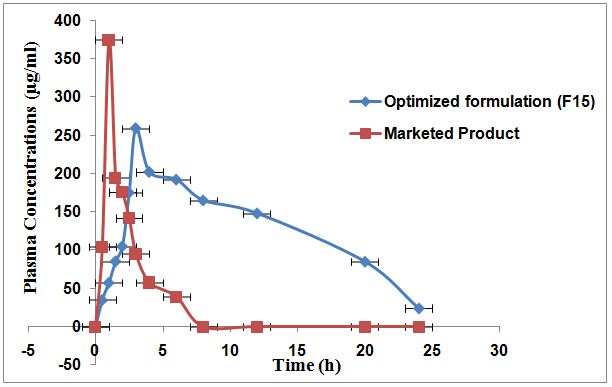 Mean plasma concentration profiles of prepared Risperidone optimized formulation and marketed product are presented in fig. 13. Risperidone optimized formulation exhibited as sustained release in vivo when compared with innovator tablet. All the pharmacokinetics parameters displayed in table 9. In this study in human subjects, prolonged drug absorption was achieved with the test formulation. The average peak concentration of the test formulation was significantly lower than that of the reference (4.35±73ng/ml for the test formulation versus 5.10±33ng/ml for the reference). In order to estimate the amount of drug absorbed from the test formulation, the relative bioavailability was calculated from the AUC of the reference and test formulations (23.80±18.12ng. h/ml for the reference product versus 28.42±18.24ng. h/ml for the test formulation). The results indicated that the test formulation could increase the bioavailability of Risperidone in humans effectively. In this study, the Risperidone floating tablet produced higher bioavailability than that of a marketed product, this overall increase in bioavailability and increased gastric residence time, caused by flotation of the dosage form in the stomach.