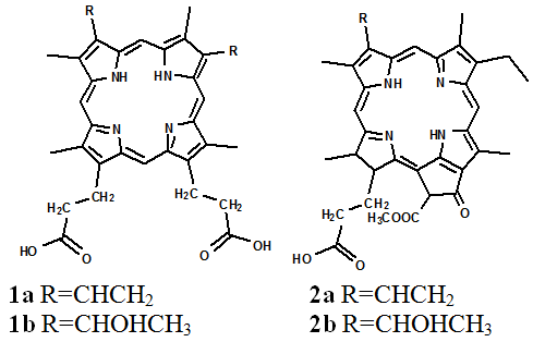 Fig. 1: Molecular structures of protoporphyrin IX (1a), pheophorbide a (2a)and its 1-hydroxyethyl derivatives
