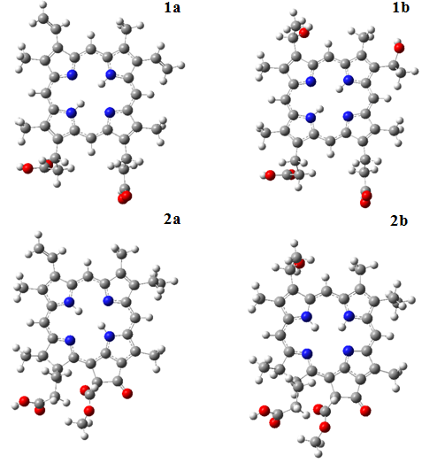 The most widely used method to calculate absorption spectra is a time-dependent density functional theory (TD-DFT) which, despite the fact that it is a single-reference method, has proven sufficiently accurate in many studies [6]. However, the performance of TD-DFT much depends on the actual functional used in the excited state calculations [7-9]. The studies show that the results can deviate significantly from experiments and that the performance of the functionals often is system specific. On the other hand, several prediction of UV-Vis spectra were performed using ZINDO [10-11]. In general, DFT methods (TD-DFT) had an extra calculation time cost compared to semiempirical methods (ZINDO). The theoretical works presented here were focused on the structural, energetic and spectroscopic behavior of protoporphyrin IX (1a), pheophorbide a (2a) and its 1-hydroxyethyl derivative (1b, 2b) (fig. 1). ZINDO and TD-DFT were used for this purpose. On the other hand, we take advantage of the λmax at Qx band predicted by these two methods in order to reach a better agreement between theoretical estimates and experimental measurements.