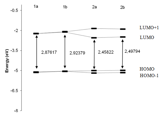 One can also note that the Q band excitation energy by ZINDO method tend to overestimate. The different trend was observed for B bands: we calculated them to be at 383 nm and 378 nm for 1a and 1b, respectively, whereas experiments report respective values of 405 and 402 nm. These bands are nonetheless not implied in phototherapy processes, so we do not analyze here in this part of the spectrum. The Q band excitation energy estimation by TD-DFT tend to be low compared with the experimental data. These results differ from those reported by Palma et al. [8]. The differences of estimation and experiment data for TD-DFT and ZINDO method were 87-90% dan 78-84%, respectively. Considering the differences values reveal the TD-DFT more accurately than ZINDO method.