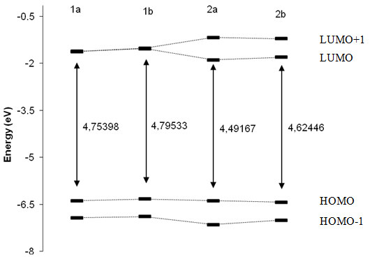 The optimized configurations of all molecules are depicted in fig. 2. The optimized structure showed a planar geometry, which is comparable to those reported earlier [8, 16]. Total energy of 1a, 1b, 2a, and 2b were-1152102,-1248032,-1223981, and-1271943 kcal/ mol, respectively. The 1-hydroxyethyl derivative of compounds studied has smaller total energy than the parent compounds.