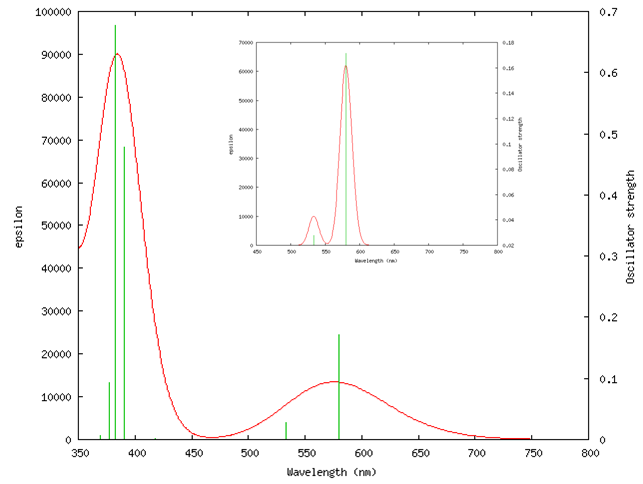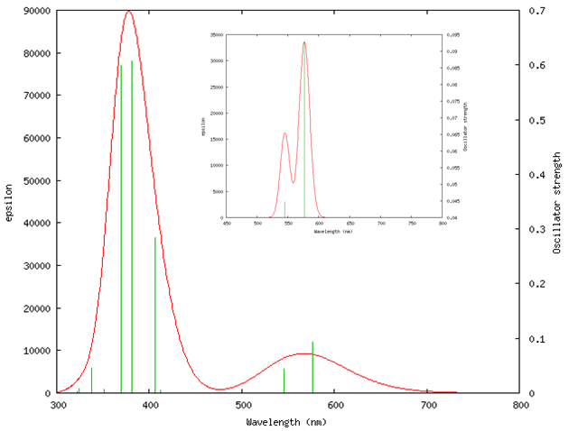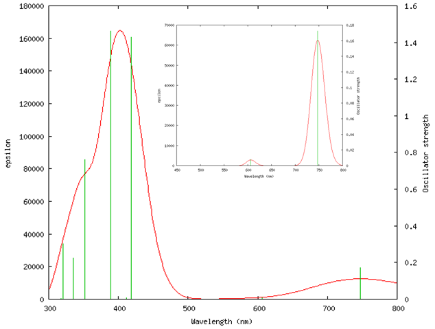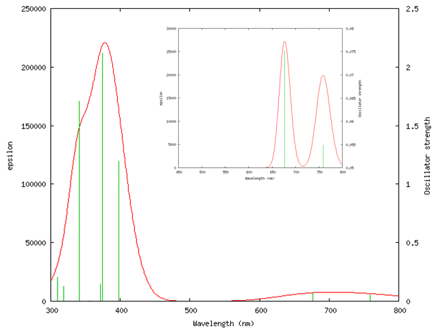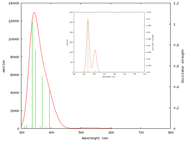 Gaussian 03 software was used to predict the electronic absorption spectra of compounds. One of the advantages of this software is that it includes a module to represent the curve of the spectrum (sum of Gaussian curves) calculated from the oscillator strengths and the wavelengths making easier to visualize the results. The simulated absorption spectrum was constructed using the oscillator strengths calculated at the ZINDO (fig. 4) and TD-DFT level of theory (fig. 5), fitted to a Gaussian distribution with a full-width at half-maximum (fwhm) of 3000 cm-1.