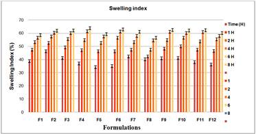 The muco-adhesion characteristic was found more in F12. This formulation contains guar gum and sodium alginate polymers which have high adhesion properties (table 4). Swelling index was calculated with respect to time (fig. 7).