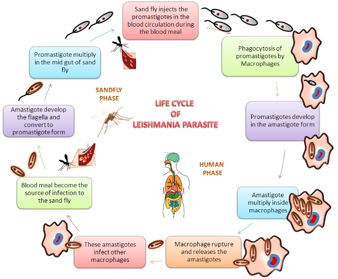 L. donovoni, the causative agent of Leishmaniasis, is an obligate parasite which is carried by the bloodsucker adult female sandfly from the infected mammalian host. Inside the midgut of the sandfly, the amastigote form of this parasite multiplies within 4-25 d via binary fission and finally transforms into promastigote. Promastigote live extracellularly in the alimentary canal of the sandfly, reproduces asexually and migrates to the proximal end of the gut for transmission to the mammalian host. The life cycle of L. donovani is represented schematically in fig. 1.