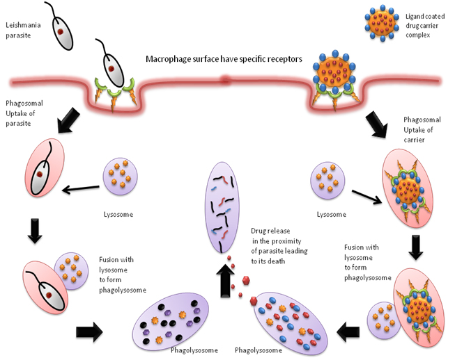 Designing a system proficient in delivering selectively the drug to the site of action is the main aspect of drug targeting. Macrophage-targeted drug delivery approach may serve as a promising means to conquer many of the aforesaid problems. Localization of leishmania parasite within the phagolysosome of macrophages restricts the bioavailability of many potentially useful antileishmanial drugs. Macrophages serve as host cells for these parasites which are able to inhibit phagosomes maturation so as to survive and replicate within the macrophages. Hence, it is difficult enough to provide access of drugs selectively to these relatively inaccessible sites. As a result, macrophage-specific drug delivery systems are the focus of interest. Therefore, it becomes imperative to exploit the concept of “magic bullet”, a novel concept of drug targeting paradigm that exploits the use of surface engineered vehicles for site specific delivery. Further, a targeting system needs to be designed keeping in view the ultimate site of action of drug which in the present case are macrophages. Thus, in the scenario, the carrier should be so conditioned that they are directed to buffer's cells either passively or otherwise actively.