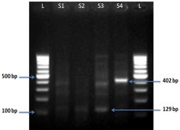Fig. 1 shown that HPV type 45 appear a band at 402 bp while HPV type 52 is appear a band at 129 bp. Molecular diagnosis of HPV infection is very important for cervical cancer screening. Commonly methods, such as hybrid capture (HC2), in situ hybridization and PCR, is very good in terms of sensitive and specificity.Nowaday,PCR most widely used in a wide range of molecular diagnostic because of its ability to detect small fragments of deoxyribonucleic acid (DNA) [11,12].