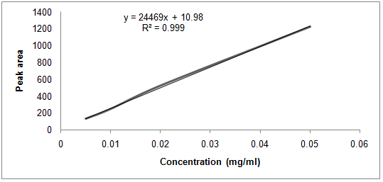 Linearity was studied for a drug by the proposed HPLC method. A Linear relationship was obtained between the area under the peak and drug concentration. A first order equation was used for calibration, where 24469x+10.98 is the regression equation and r = 0.999. The line range was from 5-50µg/ml. Calibration curve was shown in (Fig.1). The solubility studies of OXZ in different excipients at 25° C were represented in table (1). The results cleared that among the oil used; IPM exhibited the highest solubilizing potential for OXZ. The highest OXZ solubility was found in Cremophore EL and ethanol as surfactant and co-surfactant, respectively. Therefore, IPM, Cremophore EL and Ethanol were chosen for the construction of the phase diagram.