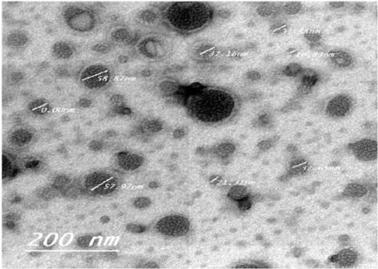 Morphology and structure of the nanoemulsion globules were performed using transmission electron microscopy (TEM) (Joel Co, 2100 HRT, Japan) operating at 40 KV. To perform the TEM observations of the nanoemulsion the formulation was first diluted with water (1:10) [25]. A drop of diluted nanoemulsion was then directly deposited on a carbon-coated copper grid, stained by 2% of uranyl acetate and observed after drying by TEM.