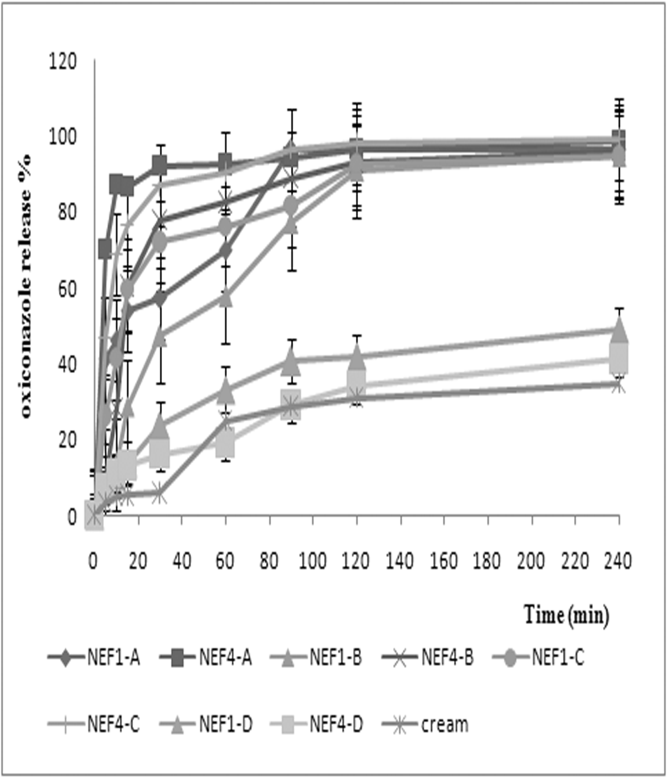 In vitro release profile of the prepared gel and Tinox ® cream is shown in Fig.5. More than 95% of OXZ were released from NEBG containing Carbopol, Na CMC and HPMC over 4 h, while only 34.75, 48.97 and 40.97% released from cream, NEF1/XGUM, and NEF4/XGUM, respectively which indicates that the drug release from gels can be controlled by polymer type.