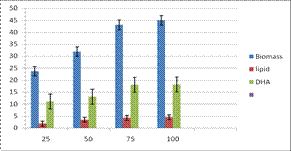 Fig. 4: Effect of temperature on biomass, lipid (g/l) and DHA ( % in lipid w/w) production by Schizochytrium sp. in distillery wastewater medium