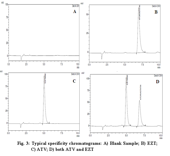 The specificity of the method is performed by separate injections of the blank, ATV, EZT and combined ATV & EZT samples.