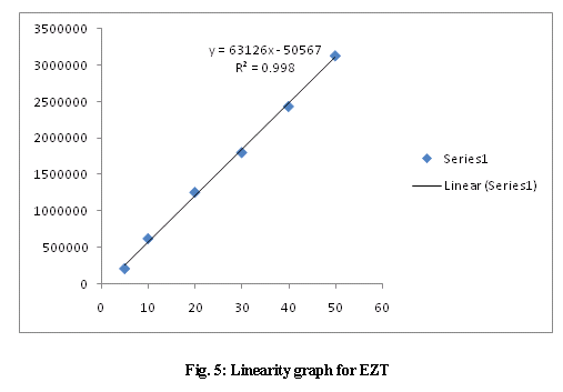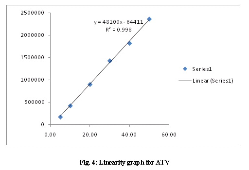 Linearity was established by least squares linear regression analysis of the calibration curve. The constructed calibration curves were linear over the concentration range of 5-50 µg/ml for both the drugs. Peak areas of ATV and EZT were plotted versus their respective concentrations in the mobile phase, and linear regression analysis performed on the resultant curves and was confirmed by the high value of the correlation coefficients 0.9983 & 0.998 for ATV and EZT respectively (table 2). Calibration curves of ATV and EZT were shown in fig. 4 and 5. The LOD and LOQ were calculated from the following equations using the standard deviation (SD) of the response of the analyte (low concentration) and the slope (m) of the corresponding calibration curve: