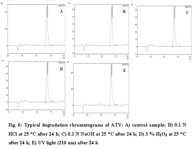 Degradation studies were performed with stress conditions of acid and base hydrolysis, oxidation and photolysis, to evaluate the ability of the proposed method to separate ATV and EZT from their degradation products [28]. The optimized method was used to study the stress degradation behavior of ATV and EZT and may be applicable in stability testing of pharmaceutical dosage forms of routine analysis. The reactions were carried out at drug concentrations each 25 µg/ml of ATV and EZT. The stressed conditions were as follows: hydrolytic conditions-acidic hydrolysis, drug solution in 0.1 M HCl was exposed for 24 h; alkaline hydrolysis, drug solution in 0.1 M NaOH was exposed for 24 h; oxidative condition–drug solution in 3% H2O2 stored for 24 h; photolytic conditions-drug solution was exposed to UV light for 6 h.