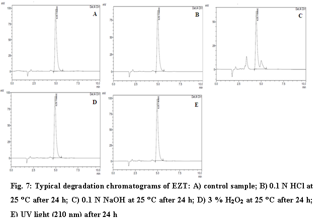 The degradation product(s) of each of the parent compound was found to be same for mild stress conditions [35, 36]. Typical chromatograms obtained for the control samples and stressed samples of ATV and EZT, using mild conditions are shown in fig. 6 A-E and 7 A-E, respectively. Possible degradation products were observed in ATV and EZT stressed samples that were subjected to light, oxidation and acid and base hydrolysis under mild conditions. ATV and EZT were stable when exposed to UV light. ATV and EZT were clearly degraded during stress by oxidation, acid and alkaline hydrolysis (table 6) leading to the formation of some unknown degradation peaks (fig. 6 & 7). Peak purity test results derived from the UV detector confirmed that the ATV and EZT peaks were homogeneous and pure in nearly all analyzed stress samples. Both ATV and EZT responses were successfully resolved from degradation products with the proposed method, as shown in fig. 6 and 7, respectively.